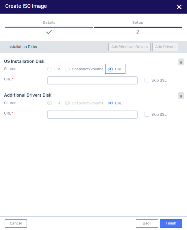 For ISO image creation, select Add Drivers to include drivers for use during and after the operating system installation. The additional drivers disk can be created from an existing file or snapshot/volume.