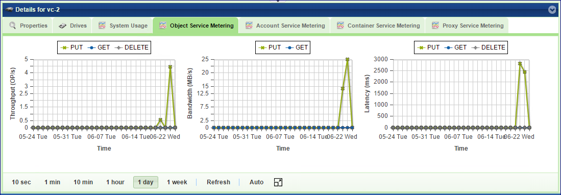 Average response time of all operations (PUT/GET/DELETE) issued to objects and handled by the selected VC per selected interval |